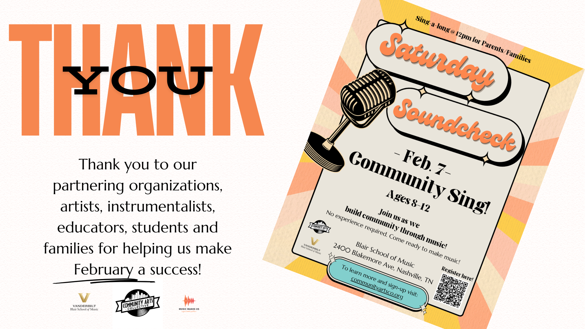 The Saturday Soundcheck experience is a blend of artistry access, music creation, and building community through the vein of song creation! Students from around the city are invited to come together for a 2-hour casual song session led by local artists and music educators in the Nashville Area.